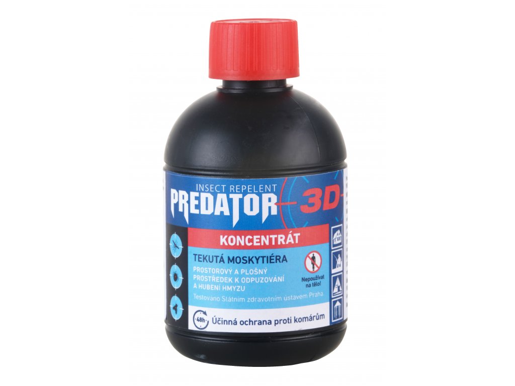 PREDATOR 3D KONCENTRÁT je určený k hubení komárů a dalšího škodlivého a obtížného hmyzu. Je použitelný i ve venkovních prostorách obytných i hospodářských budov, provozovnách a výrobnách, jakož i v objektech živočišné výroby apod. Je taktéž použitelný k venkovnímu ošetření na zahrádkách, okolí altánů, přístřešků, zahradních restaurací, tábořišť apod.